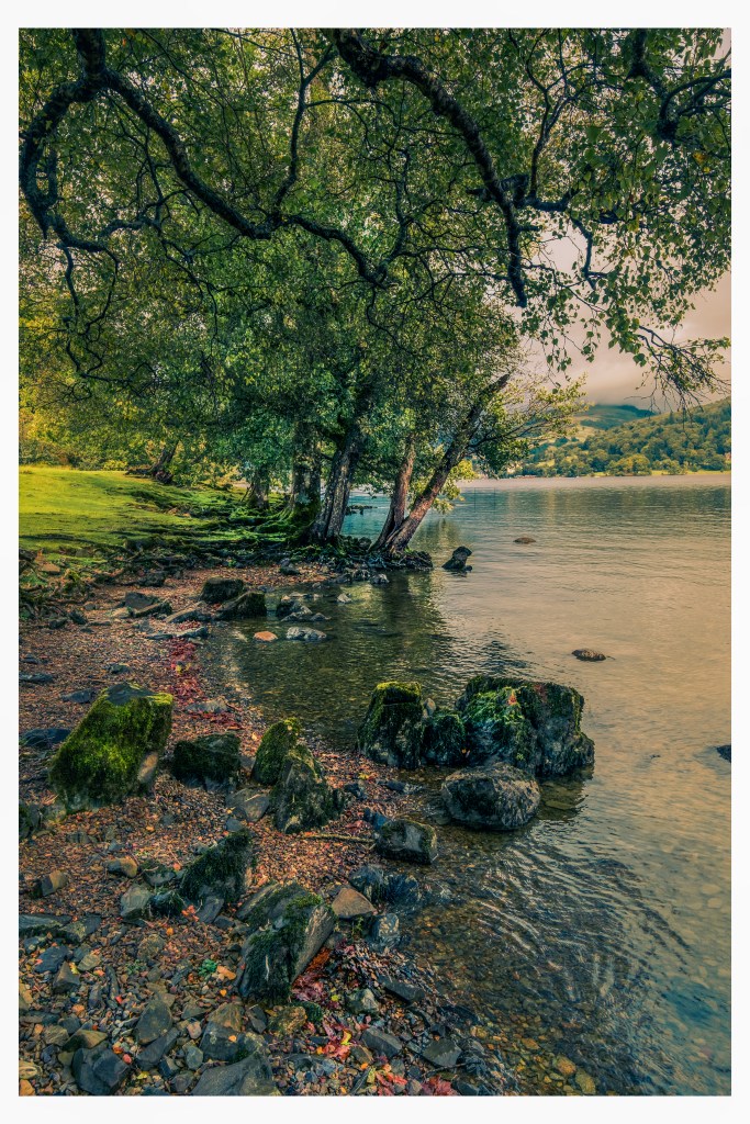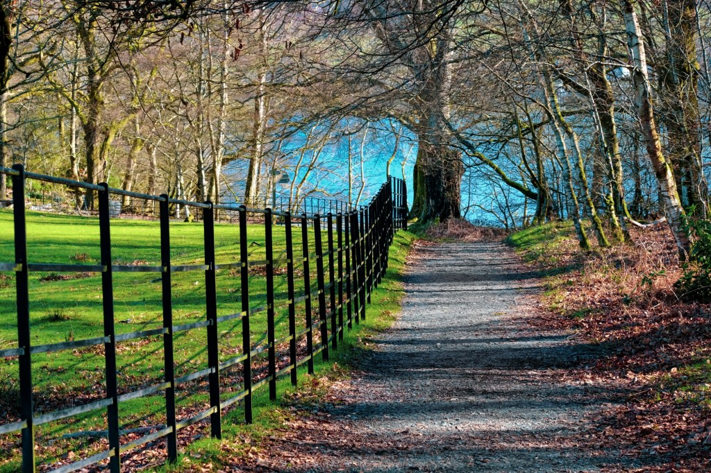 Pass through 2 iron gates onto a section of duckboards by the side of the lake and onto the rounded nose of Fisherty How. The views to Ambleside and westward toward the Langdale Pikes is exceptional. From here until you reach the woods at Wray Crag are loads of waterfowl, Canada Geese in particular. If the lake isn’t high you can walk along the gravelly shoreline and sit on lovely rounded boulders to take it all in. This upcoming woodland part of the walk is a place to linger.