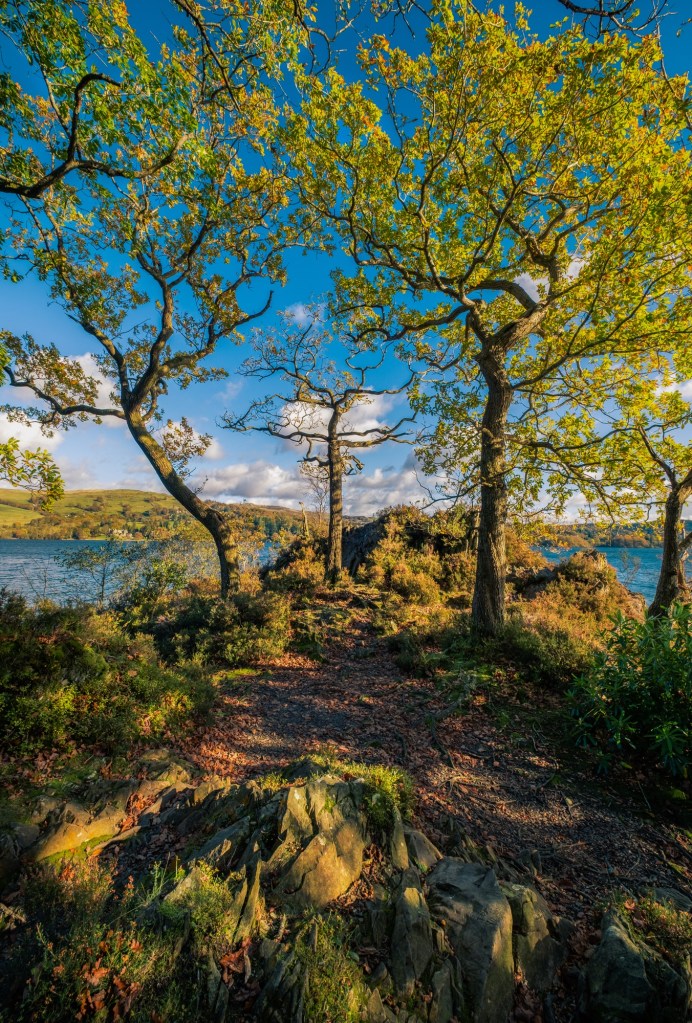 More iron gates end this section and you enter the woods of Wray Crag. Take a short detour out to your left with more stunning views up the lake. Many trees here are superb specimens and in autumn the ground is a thick leafy mattress.