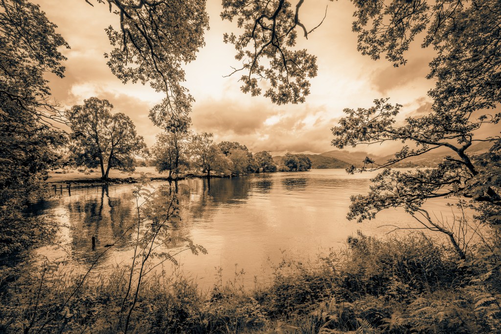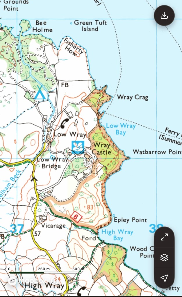 Wray Crag protrudes into the lake, with rocky perches and tiny inlets. Inevitably you will see various boats moving up and down the lake, some of the sailing boats and small motorised craft may pass close to the shore. The larger passenger ferries stay toward the middle unless heading to a landing jetty.