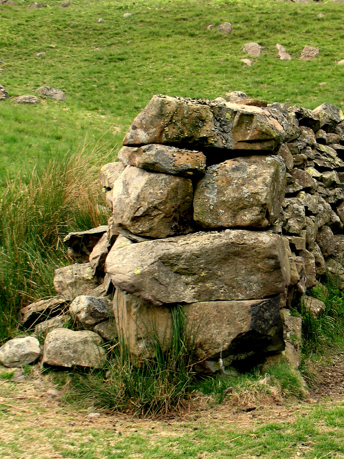 On fully collapsed walls it was difficult to filter topstones from walling stone. An experienced waller can tell by the mould and lichens, even the shape of a stone can be sufficient to set it to one side for use as a topstone.