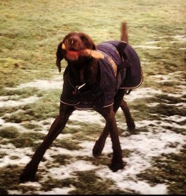 In no time at all Boz hauls himself up this side of the slimy ditch. It’s obvious that he’s struggling with the slope, front paws dug into the turf, hind legs flailing to make a purchase. His determination wins the day, he gallops over the intervening ground, enthusiasm undiminished. He rocks up, plastered head to tail-tip in mud, chocolate sauce with hints of black treacle. I have to keep backing away, arms in the air to avoid being covered in the atrocious mess. He thinks I am playing so launches himself at me. I jump to one side, my feet crush through the thin icy surface of another puddle and I slip to the deck. Boz jumps on top of me, literally laughing into my face, paws pounding on my jacket.