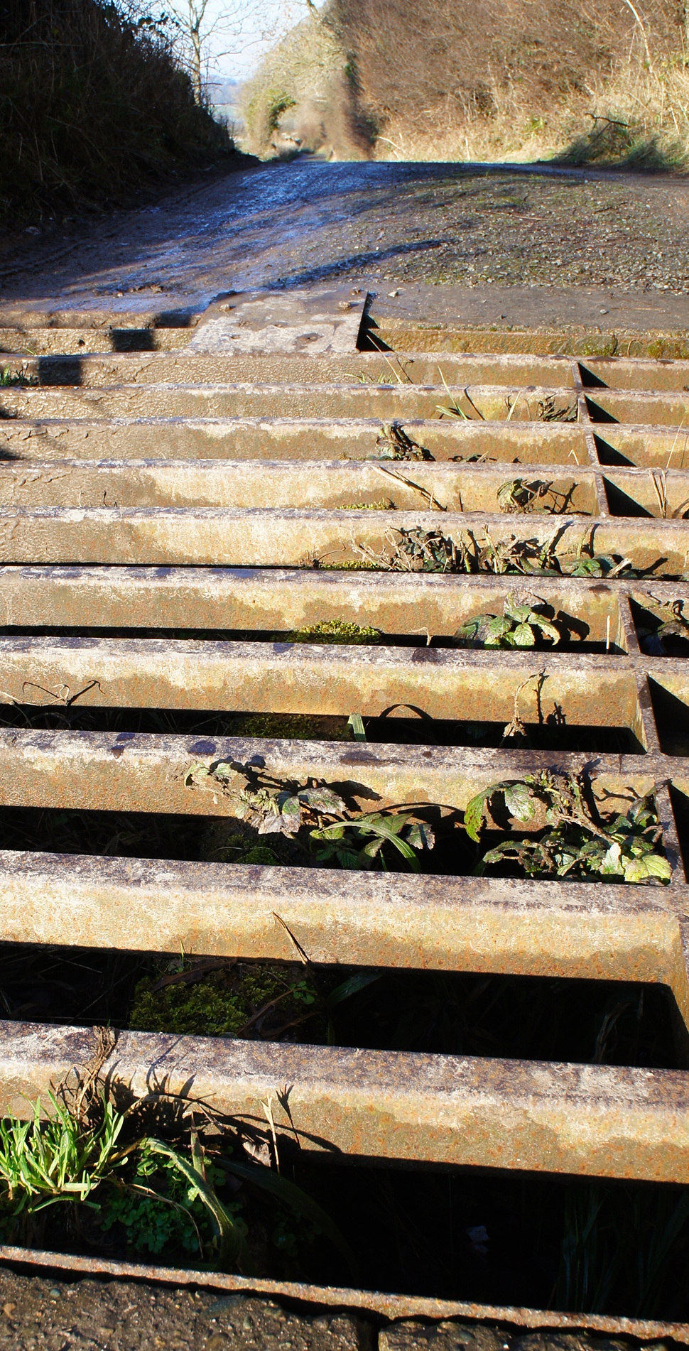 We walk away from the soggy shore toward the lane and encounter the first obstacle. Probably an 8 on the doggie scale of difficulty. A cattlegrid. This one is tricky because it also has brambles fully up to the edges of the grid. I observe as she ponders the situation. She looks at me, a glob of slobber flippers off the end of her tongue onto my sleeve.