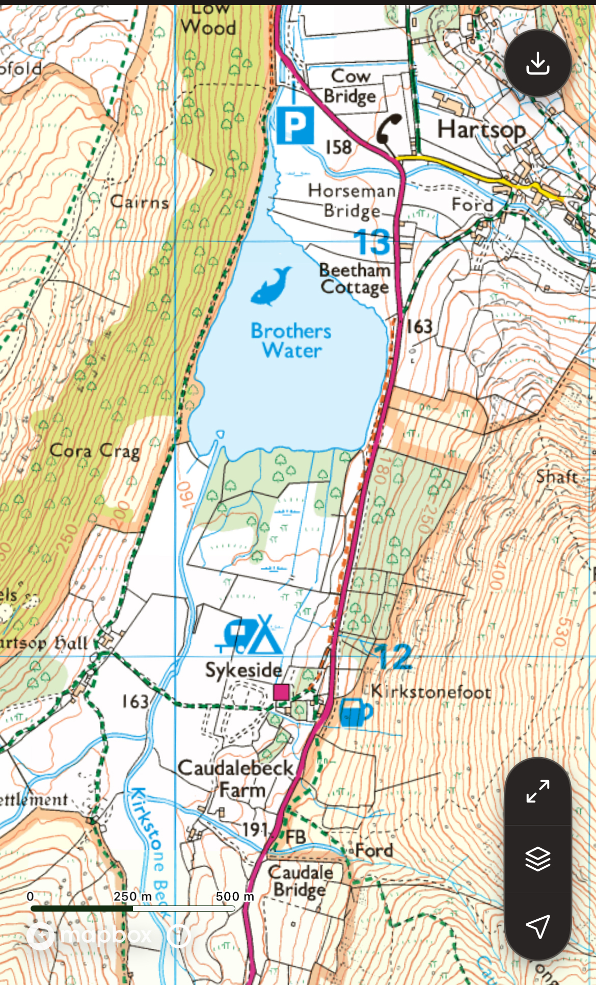A few hundred metres more past the shop/reception building we trundle up the slope to the Brotherswater Inn. Difficult not to stop there for a cold drink before scooting back through the rough fields on the east side of the Kirkstone Pass road to your vehicle.